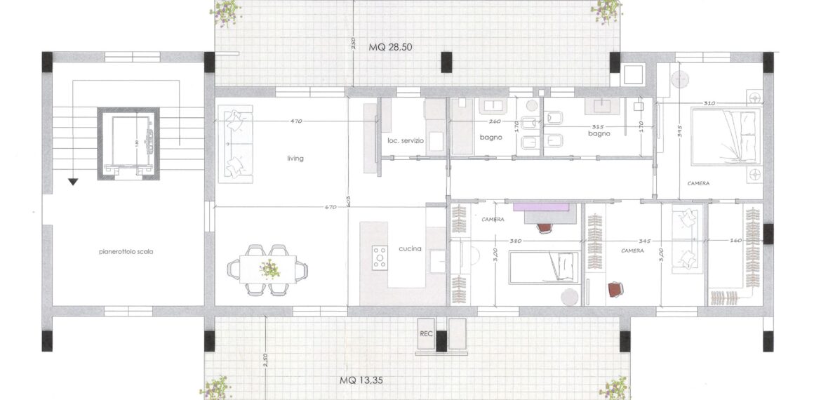 Composto da: ampio salone con angolo cottura in open space, corridoio, 1 camera matrimoniale, 2 cameretta, una comodissima lavanderia e 2 bagni.