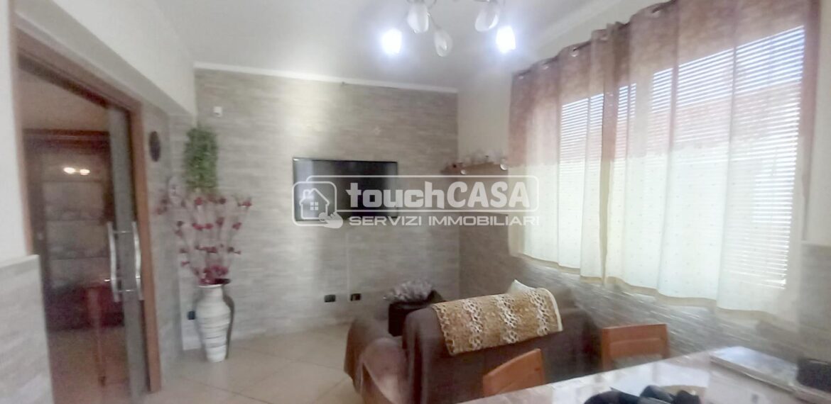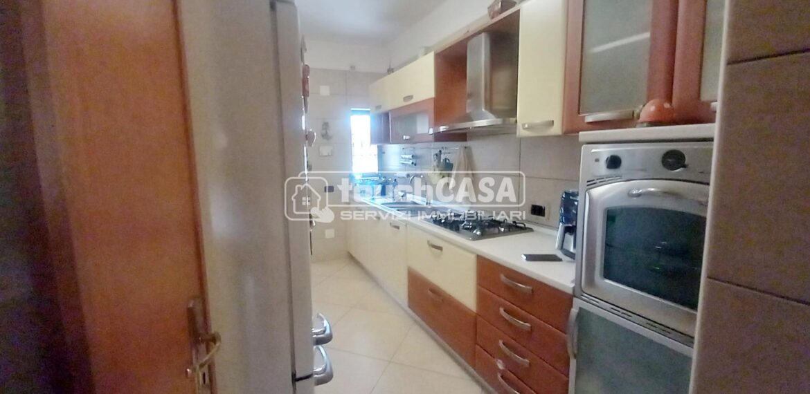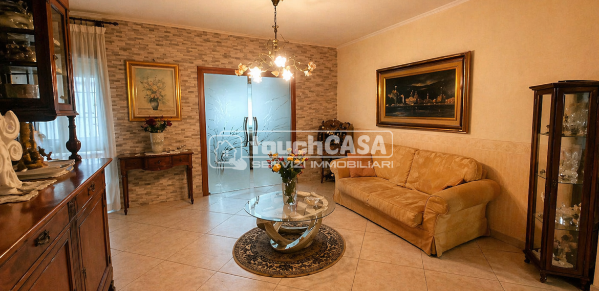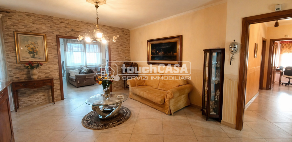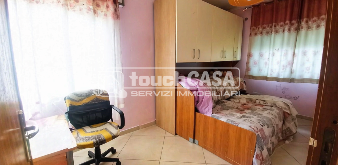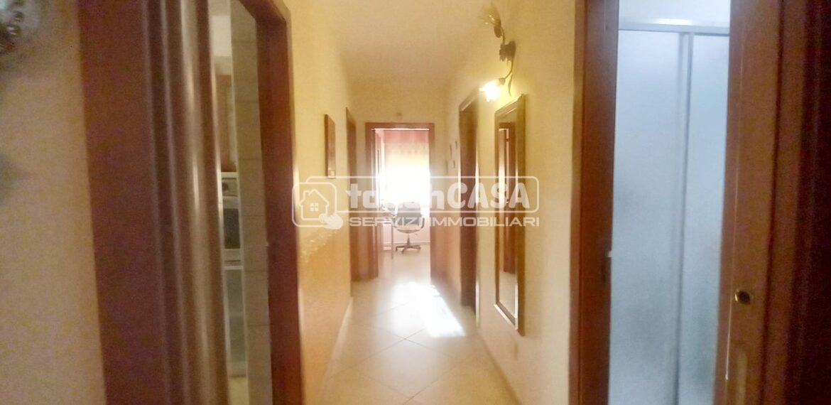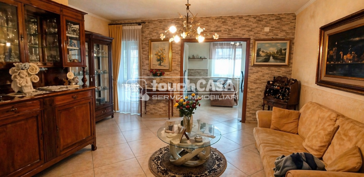 Suddiviso in: salone, cucina con tinello, corridoio, 1 camera matrimoniale, 2 camerette e 2 bagni.